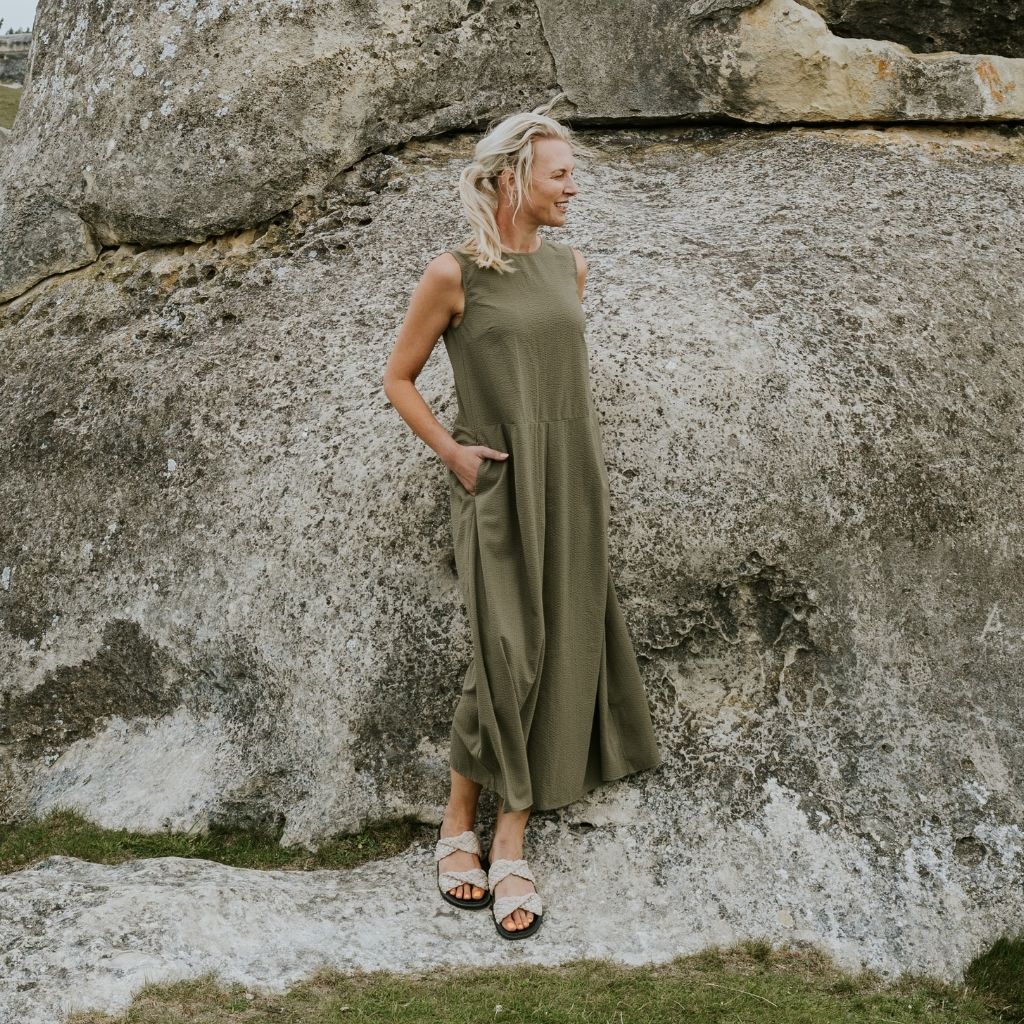 The drop-waist silhouette gently skims the body before falling into a paneled skirt that adds movement without bulk. A classic crew neckline keeps things clean and balanced, while the zip-and-button closure at the back offers a neat, secure fit. Thoughtful side pockets add everyday ease - because practicality should always feel this good.