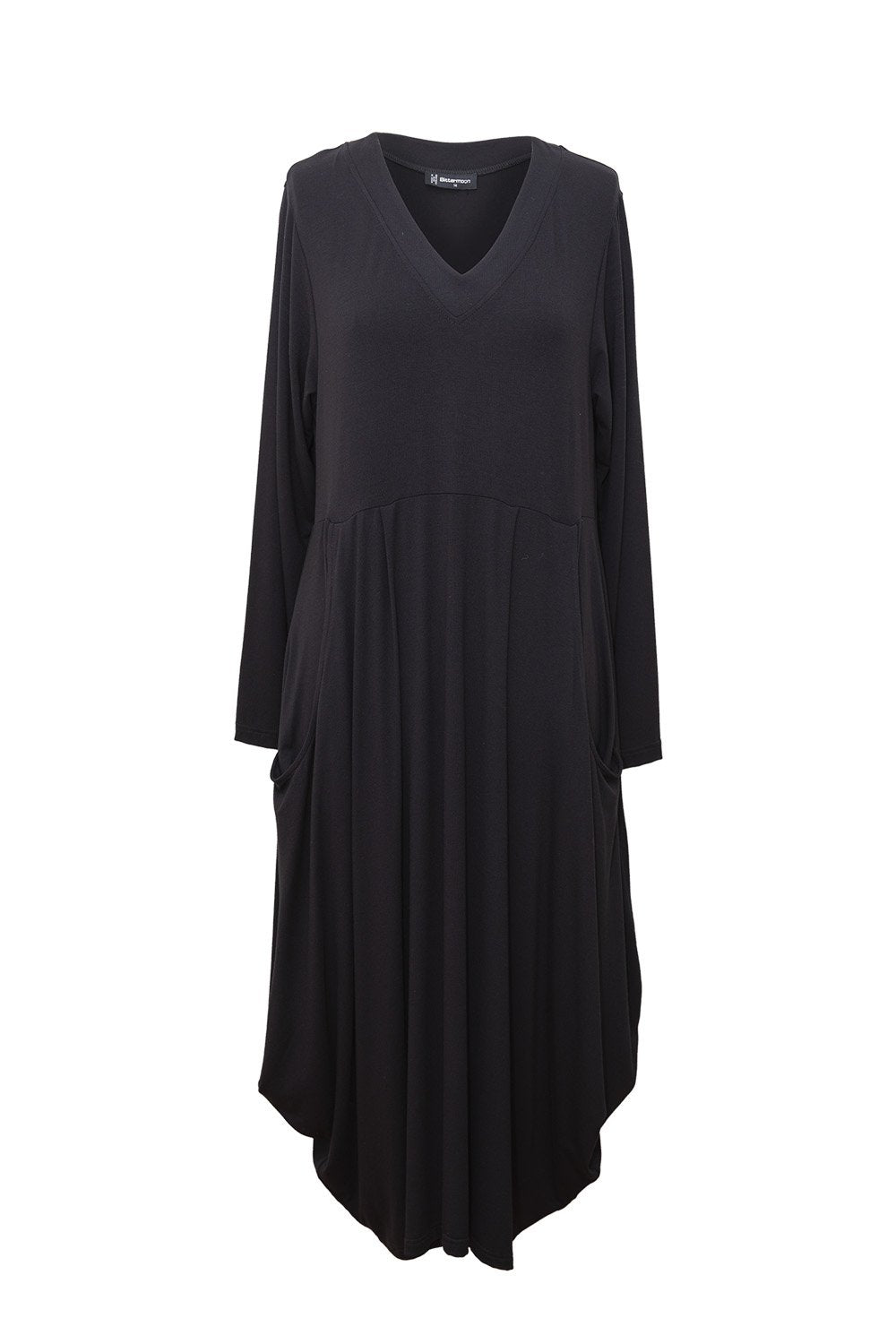 A contemporary Bittermoon Carly Dress in a classic black. A best-selling style in a beautiful stretch viscose, that features a gorgeous cocoon-style skirt with a fitted bodice, V neckline and long sleeves. Best of all, this dress has pockets! A versatile dress for any occasion.