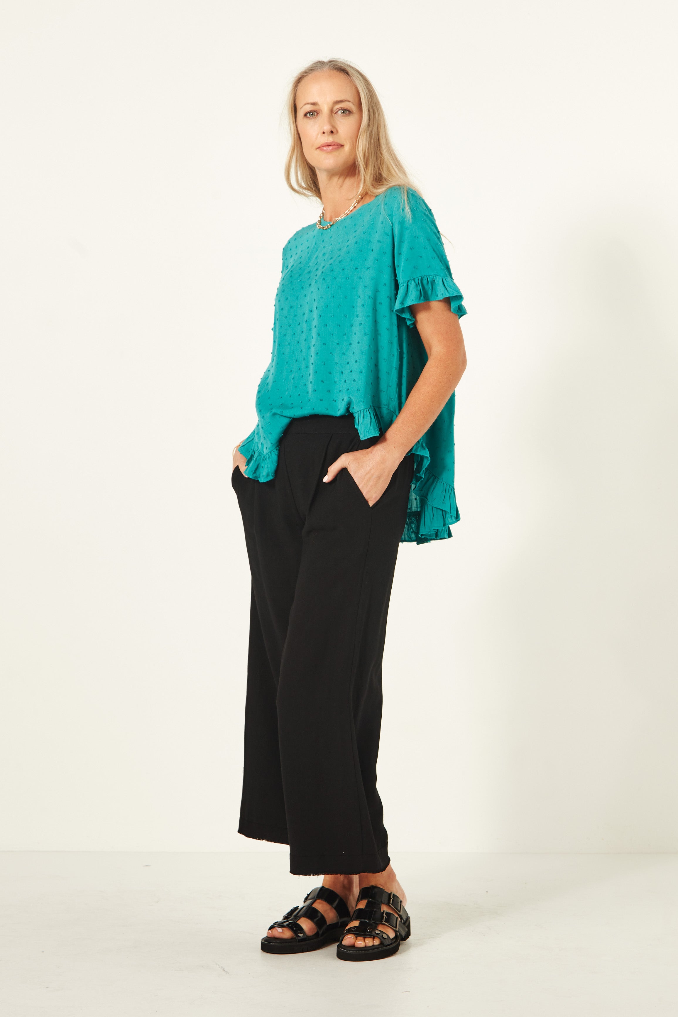 Designed with a loose fit and front pleats, our Jimena linen pants offer both comfort and sophistication. The elasticated waistband at the back ensures a perfect fit, while frayed edges at the bottom hem add a touch of casual charm. Falling to ankle length, these pants are ideal for effortless styling from day to evening, combining versatility with laid-back elegance.