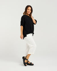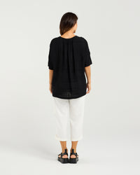 Our timeless top with a gathered front waistband and slightly longer finish in the back with a subtle plaid as an added detail.